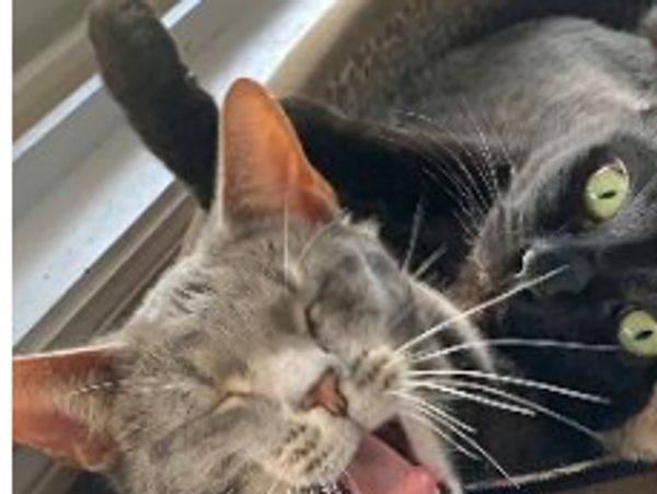 An alert UPS driver led to a rescue in Menlo Park of several adults for TNR and kittens to adopt out. Madeline and Ricochet are 2 of those kittens. At 5 months old, it took some doing to get them to trust, but with a lot of good food, love, and patience, Maddy and Ricky were adopted by their new loving mom, LaVonne.